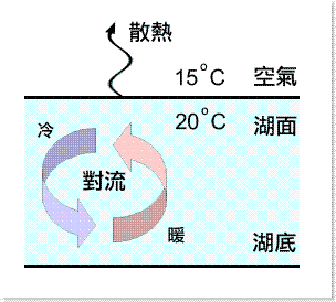先從水溫高於 3.98℃ 的情況說起。看看圖一,湖的表面水溫是 20℃,氣溫較水溫低了 5 度,即 15℃。部份在湖表面的水份子的熱能會流向較低溫的空氣,結果水份子的溫度下降了,而密度卻增加了,所以這些水份子會向下沉,而水面下較高溫的水,因為密度較低而逐漸往上升,形成對流,整個湖的水遂漸冷卻。